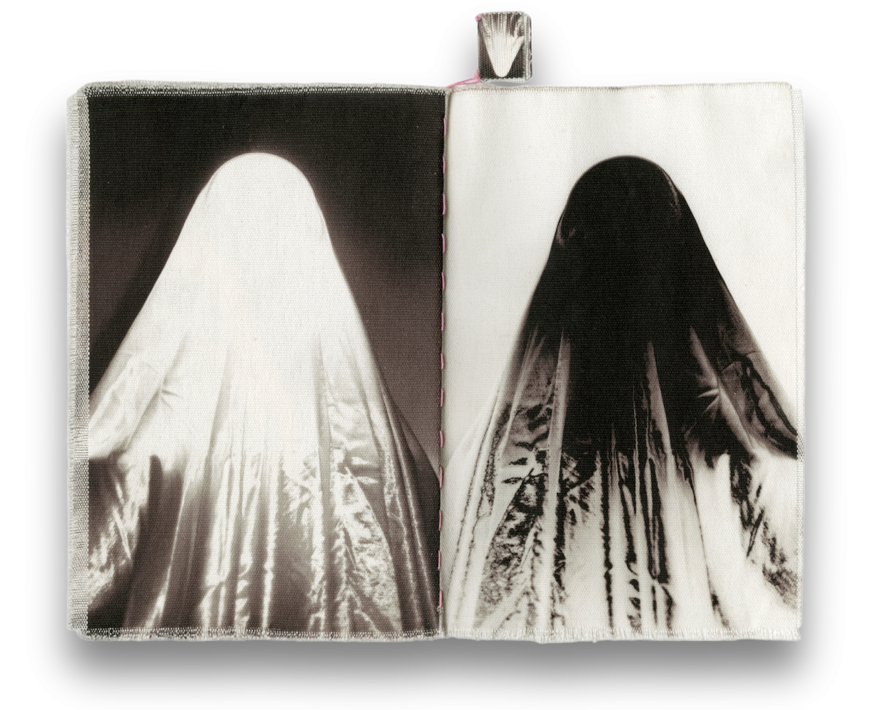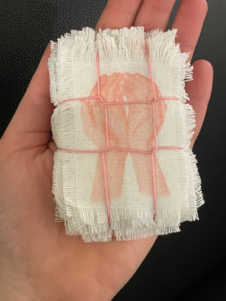 My Two Bodies, Inkjet Print on Cotton, 11 x7 in.,202433 Handouts, inkjet print on fabric, 3 x 4 in., 2025Disjoint, chapbook, inkjet print on newsprint, 5 x 8 in., 2024Words Need Touch, installation with fabric and keyboard, various dimensions, 2025Spaced (detail shot), Inkjet Print on Cotton, 5 x 7 in ,2024